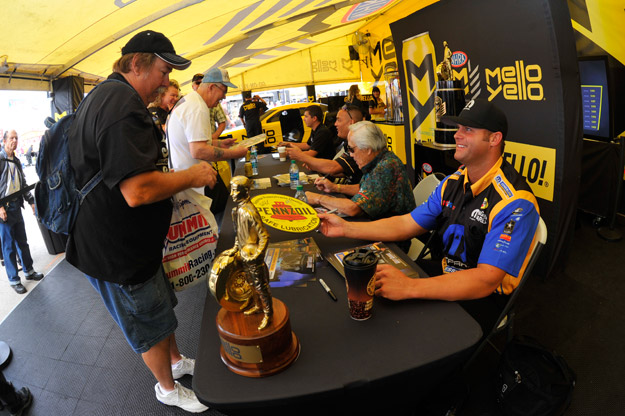 Former NHRA Mello Yello champions Matt Hagan and Tony Schumacher, along with Dallas Pro Stock champ Drew Skillman and iconic Funny Car owner Roland Leong, took part in the traditional Mello Yello autograph session.