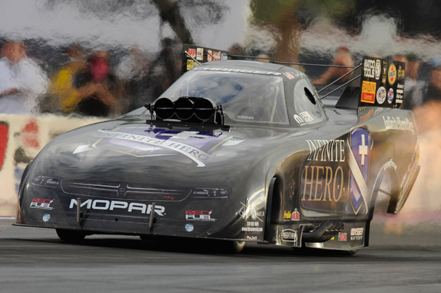 After losing to points leader Ron Capps in round two in Dallas, Jack Beckman joked that his only chance of catching Capps would be for Capps to fail to qualify in Las Vegas – as he stunningly did at the spring event here. Those fantasies pretty much disappeared when Capps’ NAPA Auto Parts Charger streaked to a 3.897 in Q1, then bettered it with a 3.881 in Q2 and they ended up third.