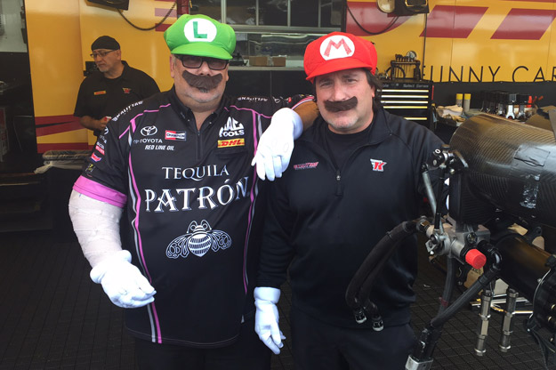 It’s been a few years since announcer Bob Frey nicknamed good pals and fellow nitro crew chiefs Nicky Boninfante and Tommy DeLago the Super Mario Brothers, and with Halloween fast approaching, the duo finally acted on the suggestion this weekend. Boninfante, co-crew chief for Del Worsham, donned the red hat and mustache of Mario while DeLago, tuner for Alexis DeJoria, took on the Luigi persona.