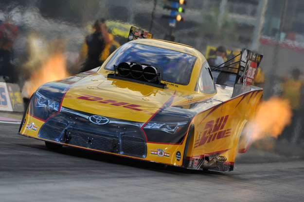 Del Worsham may have lost a low e.t. pass in Friday’s first qualifying session as his DHL Toyota was well ahead of the pace being set by qualifying mate Robert Hight on his then-track-record 3.913 pass. Worsham was more than two-hundredths quicker than Hight to 330 and even further ahead by 660 feet before Worsham had to lift when the car wouldn’t respond to his steering inputs. The chassis was fronthalved just before the Dallas event and the toe-in/toe-out settings on the front tires were fluctuating.