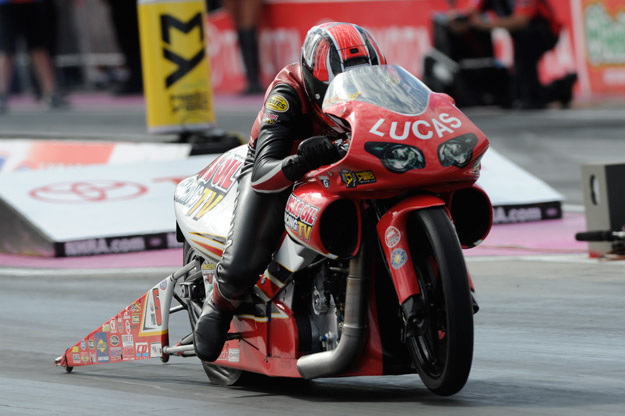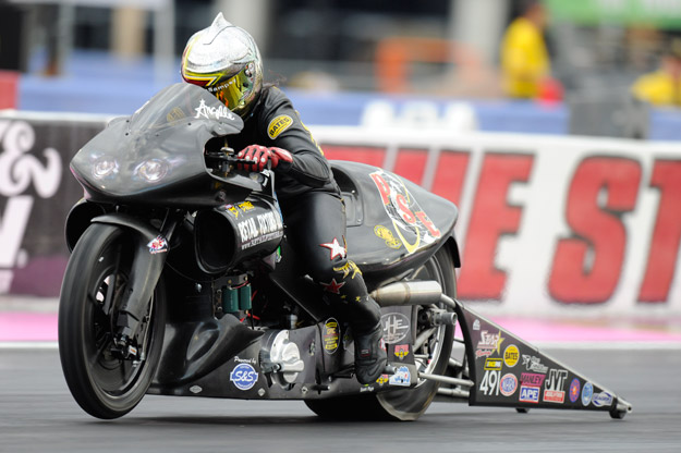 At three of the last four races, the Buells of the Aranas have lined up alongside one another for the first round. Now, it’s Star Racing’s turn. Angelle Sampey (pictured) and Cory Reed entered today’s final qualifying in the No. 8 and 9 spots, respectively, looking to move in the order and try to prevent the undesirable first-round match between them. The good news is they did move around in the order. The bad news is they did so in such a way that still ended up with them lining up for the first round. Sampey moved up to fifth thanks to her 6.96 in Q3, while Reed was unable to better his 7.00 from Friday and slipped to 12th. This will be the third time the Star teammates have raced this year; each have won one of the previous pairings.