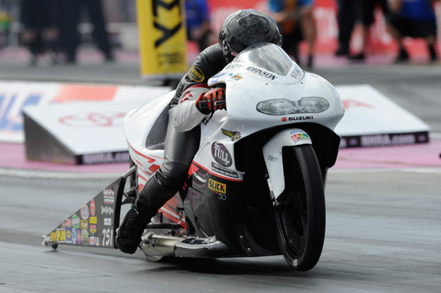 “I’ve got my costume on. I’m trying to be a professional businessman and motorcycle racer. Come by and see me,” Steve Johnson joked at the top end after his first run of the day.