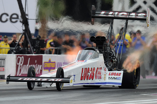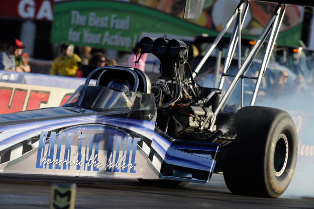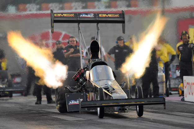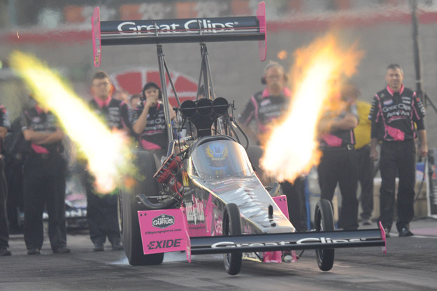 “The championship is still mathematically possible for us, and, to be realistic, if someone locked Ron Capps in a hotel room for the next two weeks and we won everything, we could pass him in the points. But that car is running well every lap, Ron is driving well every lap, and they’re not in a slump. So our short-term goal is a trophy here and a trophy in Pomona. It’s possible for us to finish second, but I think we’d be happy to leave with some trophies.”