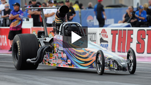 The battle for the Top Alcohol Funny Car title was epic with 27 cars fighting for just 16 qualifying spots, resulting in a record 5.664 bump spot. After qualifying No. 5, Terry Ruckman went the distance in eliminations, driving to a 5.642 to 5.779 victory over DJ Cox Jr. in the final. Ruckman, the winner of the spring Las Vegas event last April, topped Jay Payne and Swedish drivers Johan Lindberg and Ulf Leanders to reach the final round. [Watch video]