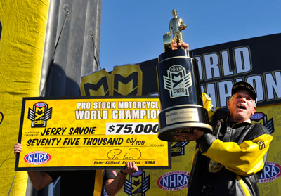 Likable Louisiana alligator farmer Jerry Savoie completed one of the most improbable championship runs in history on Sunday at the Auto Club NHRA Finals in Pomona when he clinched the NHRA Mello Yello Pro Stock Motorcycle title. Savoie, on his White Alligator Suzuki, held off the factory-backed Screamin’ Eagle Harley-Davidson V-Rods of Eddie Krawiec and Andrew Hines to win the championship.