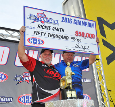 NHRA J&A Service Pro Mod Drag Racing Series veteran Rickie Smith locked up his third world championship in four years after successfully qualifying his IDG Chevrolet Camaro for the field at the season-ending NHRA Toyota Nationals at The Strip at Las Vegas Motor Speedway.