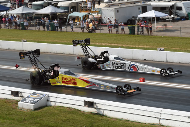 There were three races in the second round of Funny Car decided by less than a tenth, but none were closer than the one between former champs Beckman, far lane, and Force, which was decided by .001-second. Beckman left the starting line first, .062 to .080, and he turned the advantage into a 3.97 to 3.96 holeshot win.