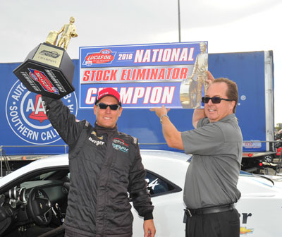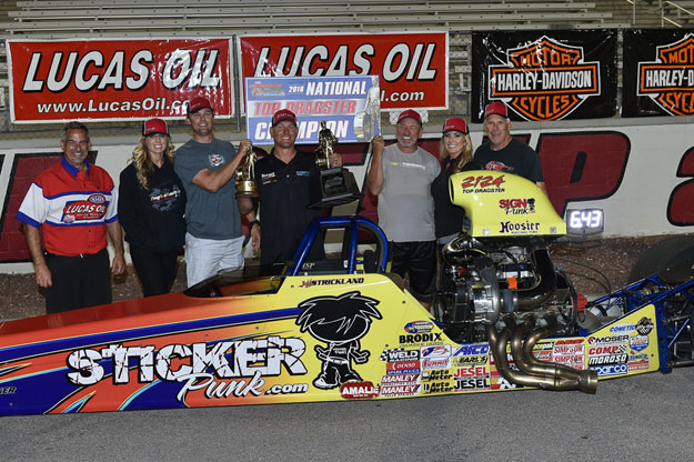 Strickland clinched the Stock title in dramatic fashion at Auto Club Raceway at Pomona, defeating the only man with a chance to pass him in the standings, former two-time national champ Brad Burton, in a head-to-head match.