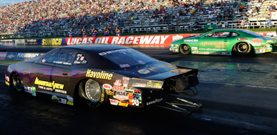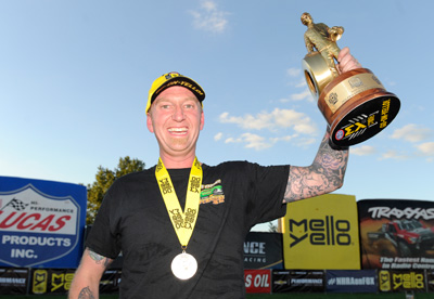 Strong, who joined the Pro Stock class last season, was the No. 14 qualifier in the 15-car field on the original race weekend a month ago at Pacific Raceways. He benefited from extraordinary fortune in eliminations with wins against Greg Anderson, Erica Enders, and Bo Butner. Anderson lost when his transmission jumped out of gear, and Enders and Butner had to shut off when their cars got loose. Strong, whose Camaro is powered by an Elite Motorsports engine and tuned by four-time national champion Greg Stanfield, was still at least .05-second in arrears of Nobile when the final shifted to Indy, but his good fortune held up.