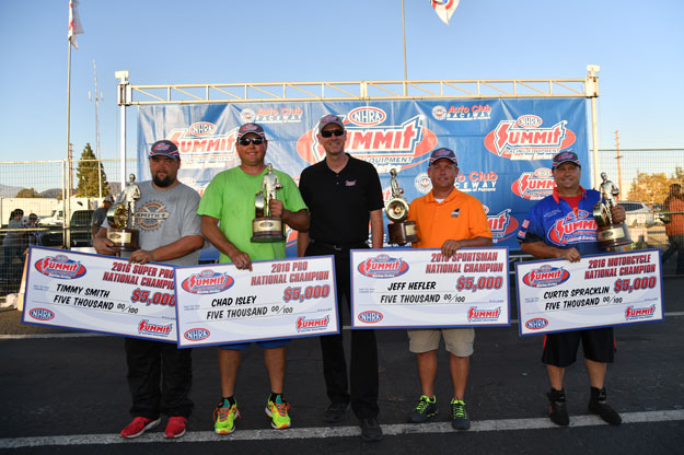 Jeff Hefler won his third Summit Racing Series national championship and was joined in victory by Timothy Smith, Chad Isley, and Curtis Spracklin as the yearlong competition raced to a conclusion at the Auto Club NHRA Finals.