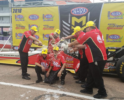 From Charlotte we headed to Houston, which ended up being a pretty great weekend for us! Both Doug and Alexis were No. 2 qualifiers in their classes, with Alexis posting a 3.910 e.t. to reset her career-best e.t. again! That’s been a bit of a trend for her at the last few events, and I’ve gotta say, it’s a trend I like to see. Del reset the track speed record in his DHL Camry with a 328.06 mph lap in qualifying, so I think it’s safe to say that our Funny Cars are on the right track. J.R. struggled a bit in qualifying and got paired with a tough first round matchup against Antron Brown. Unfortunately, the SealMaster team was eliminated in first round, but they were ready to come back swinging in Atlanta. Both Del and Alexis went out in round two after some tough pairings, but we still had hope for a Wally since Doug was still in. Doug defeated Haddock, Kinsley, and Pritchett on his road to the final, and then got the win over Steve Torrence on a holeshot to hoist his first Wally of 2016! It was the first win for two of our new crew guys on the Mac Tools car, Andrew and Tyler, so they got the traditional Mello Yello shower. It’s always so much fun to me to watch the Mello Yello showers for the rookies because even though they’re getting soaked in sticky soda, they’re still grinning from ear-to-ear.