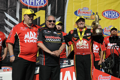 Kalitta, who had recently scored his first win of the season in Houston, got a .050 to .071 advantage off the starting line that Todd picked away in every timed increment down the racetrack. The Connie Kalitta- and Rob Flynn-tuned SealMaster dragster caught up to the Mac Tools machine at the very end, and the true margin at the finish line was indecipherable to those watching. The electronic timing system clocked them as a dead heat to the ten-thousandth of a second (.0000). Kalitta’s 3.801 got the nod over Todd’s 3.780 on a holeshot in an incredible race.