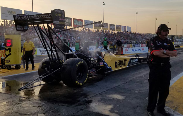 After Charlotte, our guys headed straight to St. Louis with all of the trucks and trailers to get ready for another hot weekend. It had been about 90 degrees and humid all weekend in Charlotte, and the weather was going to be about the same in St. Louis. The hot weather made for some tricky racing conditions on Sunday, and we didn’t have the performance we were hoping for. Del and Alexis had tough competition in first round, racing John Force and Tommy Johnson Jr. respectively, and both suffered first round exits. J.R. had a strong showing in his SealMaster dragster, advancing to the semifinals before Tony Schumacher got the win over him. Doug made it to the second round in his special look DeWalt FlexVolt dragster before dropping a cylinder and losing to Shawn Langdon. The bright side was that Shawn Langdon actually took out Antron Brown in first round, so Doug was able to make up some ground on Antron and is now less than a round out of first place! Of course, the team was hoping to make more of a move than they did, but they will have another opportunity this weekend in Reading.