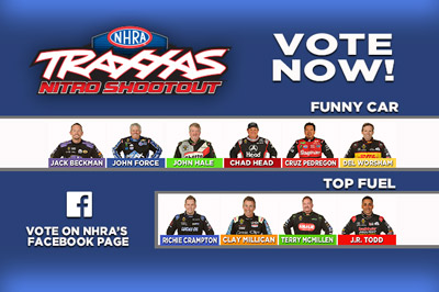 Top Fuel and Funny Car drivers will rely on fan votes and random lottery drawings to claim the final spot in the NHRA Traxxas Nitro Shootout in their respective categories. The final position in each category of the all-star event will be determined in the next 10 days and announced at the Fan Fest previewing the Chevrolet Performance U.S. Nationals on Wednesday, Aug. 31.