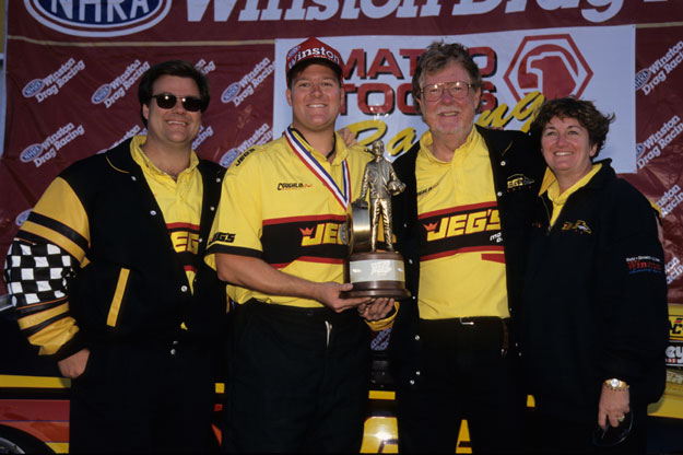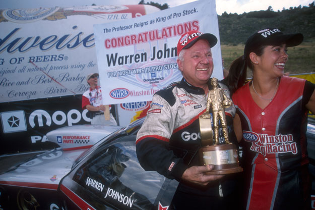 They don’t call him the “Professor of Pro Stock” for nothing — Johnson proved time and again he was one of the best to ever climb behind the wheel of a factory hot rod, racking up an amazing 97 wins, not to mention six world championships. W.J. collected the first of his record 97 Wallys at the 1982 Englishtown event, where he bested another legend, Lee Shepherd, in the final. Johnson’s 97th win came in St. Louis in 2010, where, after a bizarre race day during which he quipped he could have staged backwards and probably still won, he defeated Jeg Coughlin Jr. in the title round.