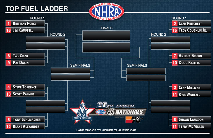 Eliminations at the 20th annual Fallen Patriots NHRA Route 66 Nationals presented by K&N Filters begin 12:00 p.m. on Sunday at Route 66 Raceway.