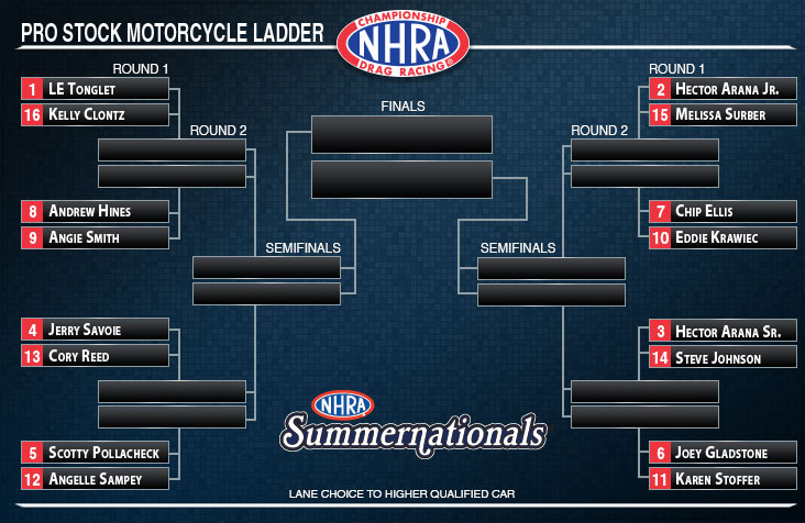 Tonglet finished atop the Pro Stock Motorcycle category with a 6.800 at 195.62 in his Nitro Fish Racing Suzuki during his second pass of Friday’s qualifying. Tonglet earned his fourth career No. 1 qualifier and notched his first in the past six seasons. He will take on Kelly Clontz in eliminations.