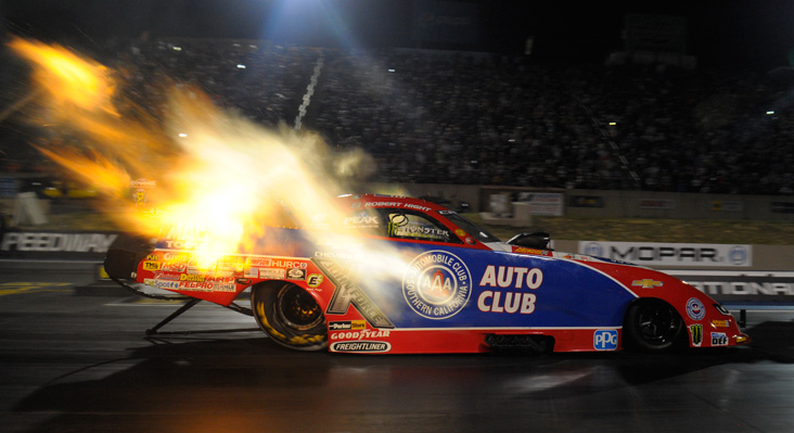 Robert Hight's Auto Club Mustang left the line with a long trail of header fir; the high altitude climes of Bandimere Speedway often provide unique flame patterns.