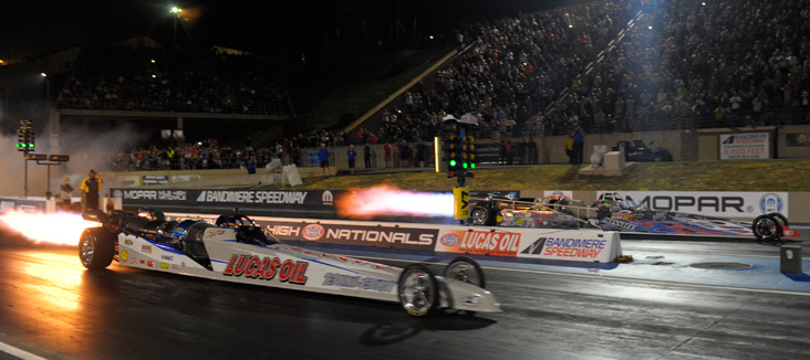 TOP FUEL Q2 (9:55 p.m.): Doug Kalitta, whose Mac Tools dragster wouldn’t even fire for the first qualifying session, bounced back with a vengeance to claim the No. 1 spot with a track-record 3.767; the old mark was 3.776 by Steve Torrence. Kalitta, winner of this event in 2010, held onto the top spot despite a strong 3.775 try by Torrence to end the session. Tony Schumacher was just a thousandth of a second back with a 3.776.