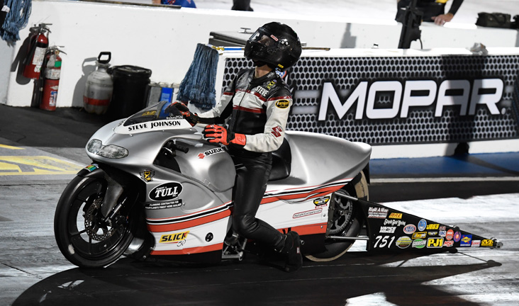 The body language says it all for veteran Pro Stock Motorcycle rider Steve Johnson, whose Suzuki died on the starting line just as he was set to take the green light.