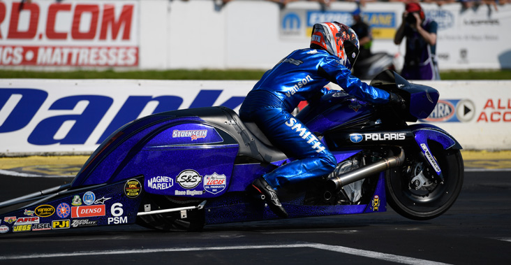 After qualifying no better than 10th at the season’s first four events, former Pro Stock Motorcycle world champ Matt Smith knew something was definitely awry with his sleek new Polaris Victory Magnum. The bike was making great power but not handling correctly, forcing him to lean hard to keep the bike on track.