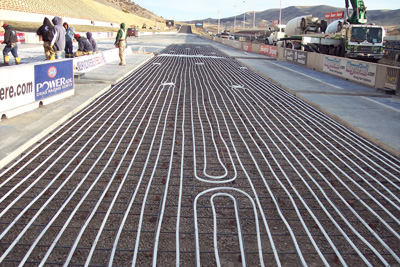 The track system is designed to act like a radiant-heat system in reverse. Rather that supplying heat, its job is to send chilled water into a network of tubing to draw heat out of the concrete slab, wicking away heat faster than the sun supplies it.