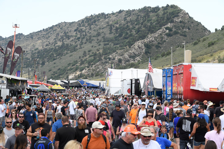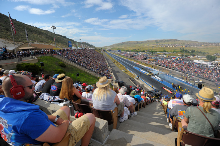 With its scenic mountain backdrop, Bandimere Speedway is a popular fan destination, and the packed pits (above) and grandstands (below) are testament to that.