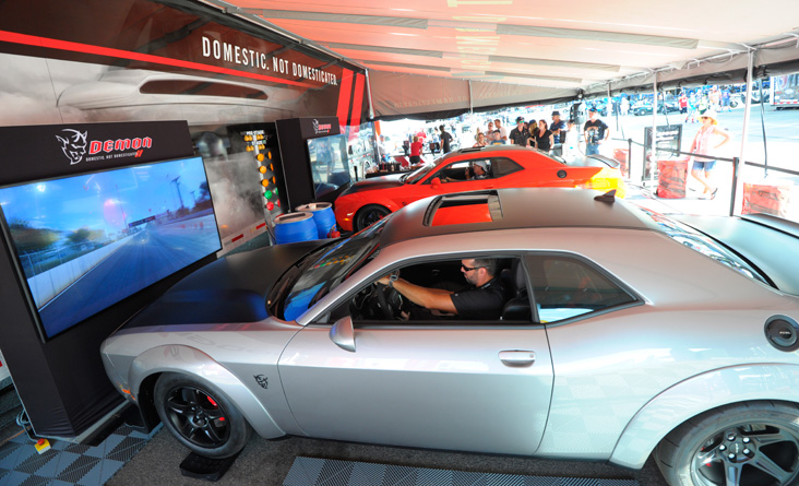 Mopar's imrpressive Dodge Demon simulator has been a popular attraction with fans who can buckle into full-sclae replicas of the hot new car for a simulated race down the dragstrip.
