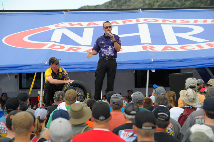"Fast Jack" Beckman and NHRA's Alan Reinhart taught some fuel-racing basics to fans during the popular Nitro School session in the pits.