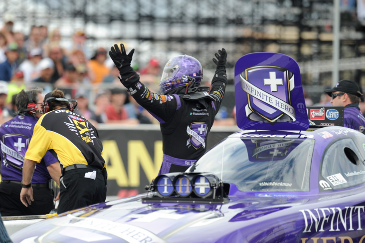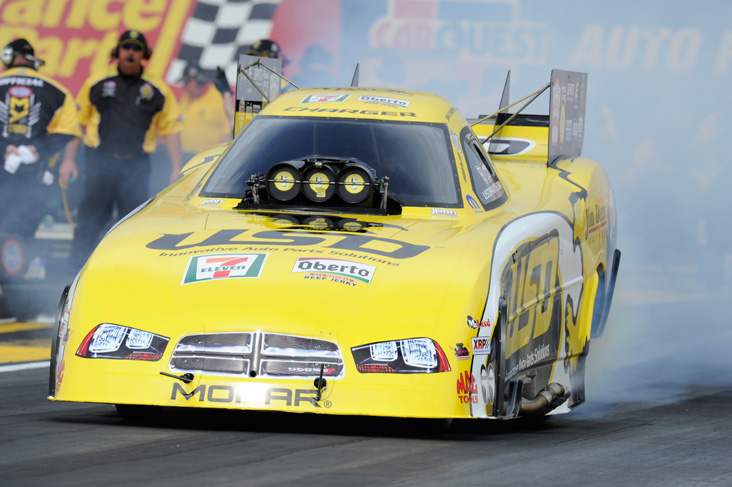 FUNNY CAR ROUND 2 (1:35 p.m.): Jim Campbell’s Cinderella run continues. The sophomore driver got around J.R. Todd, who suffered a mechanical issue and could not make a run, to advance to the semifinals, where he is surrounded by a trio of Don Schumacher Racing entries. Campbell faces reigning world champion Ron Capps in the semifinals, and Capps has lane choice after he put a 3.856 on the scoreboards; that was low e.t. of the round. On the other side of the ladder Pomona champ Matt Hagan earned a semifinal match with teammate Tommy Johnson Jr. after narrowly edging Tim Wilkerson in a great 3.88 to 3.87 match. Hagan won by .004-second on a holeshot that was bolstered by his .071 to .087 reaction-time edge. (Complete results)