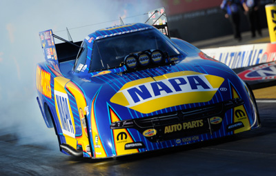 FUNNY CAR SEMIFINALS (2:45 p.m.): It will be an all-Don Schumacher Racing final round featuring reigning world champion Ron Capps and Pomona winner and points leader Matt Hagan. Capps bested upset-minded Jim Campbell in the semifinals, clocking a 3.88 to the troubled 4.89 of Campbell. Hagan got around another DSR car, Tommy Johnson Jr., in a great 3.86 to 3.88 match. That 3.86 pass gives Hagan lane choice for the final round. (Complete results)