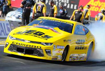 PRO STOCK ROUND 1 (12:25 p.m.): Though all three KB Racing cars — Jason Line, Greg Anderson, and Bo Butner — advanced out of the first round, they did not have low e.t. of it. That honor instead went to Jeg Coughlin Jr., who clocked a 6.535 en route to victory over Allen Johnson in the opener. Line and Anderson had the next-best runs with respective times of 6.540 and 6.544. The lone bottom-half car to advance out of round one was No. 9 Drew Skillman. (Complete results)
