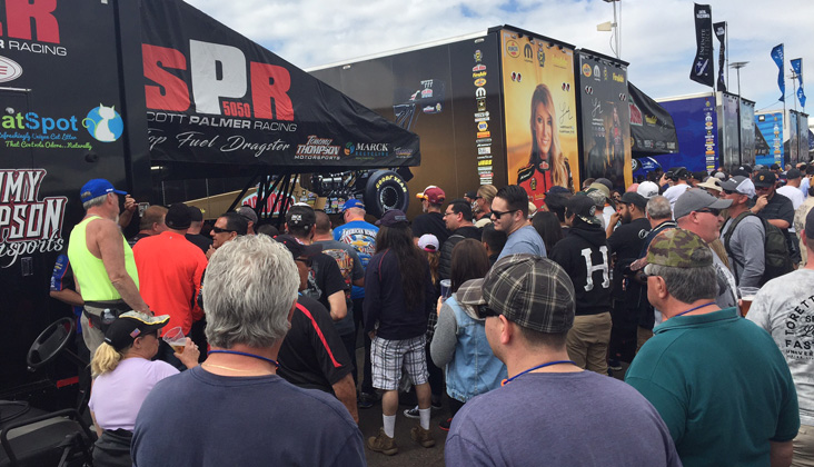 The six-deep crowd outside Scott Palmer’s pit area after his first-round upset of Troy Coughlin Jr. was not just there to cheer on the popular underdog; they knew what was coming. Palmer is the only nitro racer who still does old-school “throttle whacks” during the pre-run warm-up in the pits, and adds one for every round win.