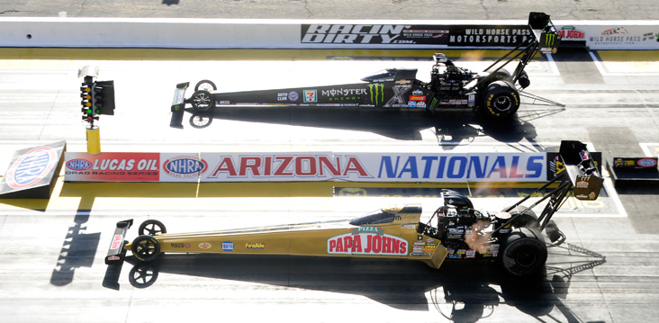 TOP FUEL FINAL (3:58 p.m.): The sequel to the final-round of the 2016 Top Fuel NHRA Arizona Nationals finale ended exactly as the original, with Leah Pritchett, near lane, beating Brittany Force on a holeshot. Last year it was 3.775 to 3.774, this year 3.705 to 3.704. In both cases, the finish was not as close as the e.t.s would indicate as Pritchett got off to a better than two-hundredths headstart on both occasions. The win is her second straight on the heels of her Winternationals win. It's the first time that a Top Fuel driver has won both of the season's first two races since Gary Scelzi in 1997.