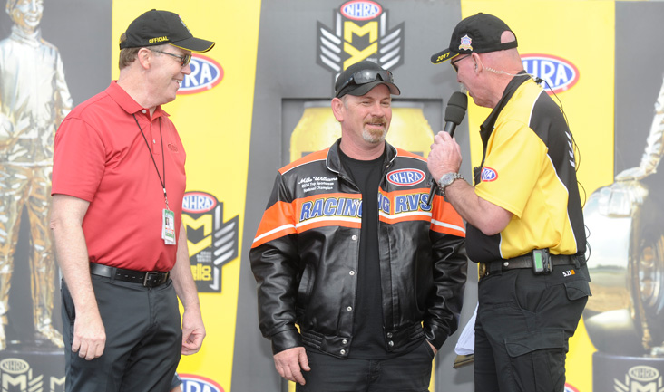 Another upset of the opening round was Gary Densham getting the win against Jack Beckman. Densham was the benefactor of a problem with Beckman’s car on the burnout. Beckman felt a vibration in his Infinite Hero Dodge and pulled off to the side, then shut the car off and climbed out, giving Densham a single run. Densham’s hazed the hides early and made a move towards the wall, but Densham reined it in and coasted to a winning 6.71. Though it’s not the ideal way to win a round, part-time runner Densham, whose last turned on a win light in 2014, said a round-win is a round-win.