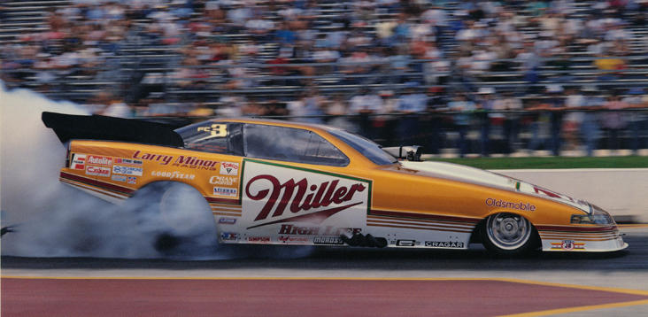 Fabled flopper pilot Ed “the Ace” McCulloch enjoyed a career renaissance in the late 1980s as part of Larry Minor’s Miller-backed team, scoring seven victories with the team after breaking a drought that extended from his 1980 U.S. Nationals win in the Super Shops Arrow until he won with Minor in Gainesville in 1986. Driving this Miller High Life Olds, “Ace” scored his fourth U.S. Nationals win in 1988 and ultimately finished a career-high second in points in 1990 (after winning Indy again), falling just two rounds shy of stopping Force from winning his first title. McCulloch would go on to add a sixth Indy title in Top Fuel in 1992 in Minor’s McDonald’s-sponsored dragster.