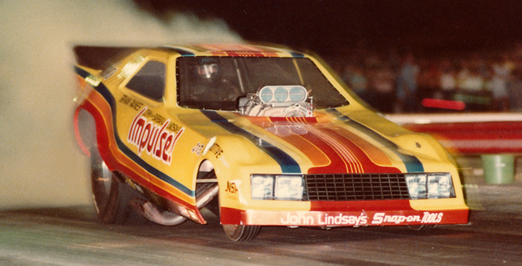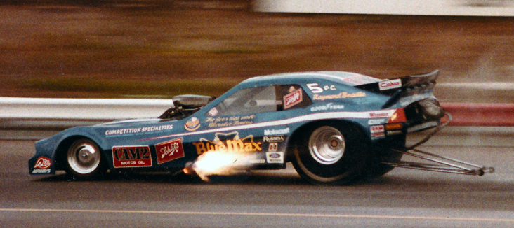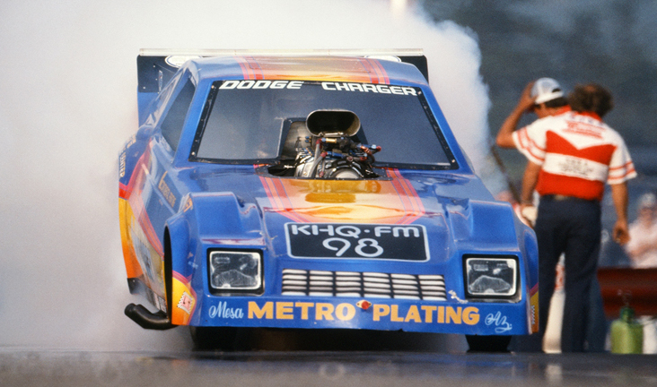 After winning the championship in 1979, Raymond Beadle and the Blue Max also won the title in the first two seasons of the new decade with his Mopar-bodied machines before switching to Ford in 1982 with this EXP, surely one of the not-prettiest Funny Car bodies in history. The Max won twice in 1982 (and also famously rolled at the Gatornationals) and slipped to fifth in points then eighth in 1983 before his final Top 10 showing, a fifth in 1984. His downfall seems to coincide with his growing interest (and expenditures) as a NASCAR team owner until the Max became a mere shell of itself, outside of new driver John Lombardo’s triumph at the 1985 U.S. Nationals.