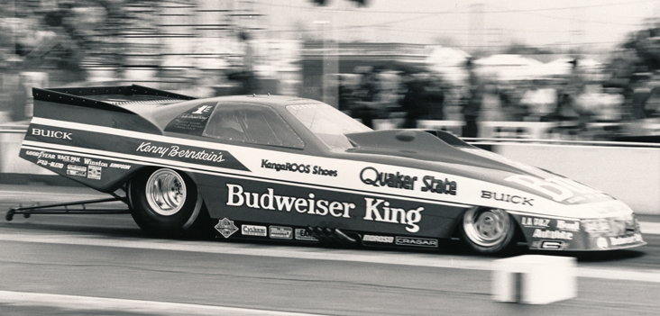 A few years ago, Bernstein recounted the tale behind the body: “Dale [Armstrong] told me what he wanted to do, and I told him, ’Well, the rules are pretty much open; you don’t have any reason not to,’ We had to build the plug and the mold before the first body ever gets kicked out, so it was a big, expensive proposition. I told him to tell me when we got to that point so I could take a look at it. So [when the first body was done], I go over there and look at it and say, ‘What in the world is that?’ I couldn’t even recognize it as a body. It was supposed to be a Buick, but I have no idea where that Buick came from. I said, ‘Oh my god; we’re in serious trouble; this is going to be tough. We’ve got to get NHRA down here; this is not going to be easy.’ Dallas Gardner, Carl Olson, Steve Gibbs, and three or four other guys came to see it, and you could hear a pin drop; they were astonished. ‘This is going to be a Funny Car body?’ They said to me, ‘We’re going to have some lunch and think about this.’ I said, ‘I’ve got $300,000 in this; go have a big lunch.’ They came back and told me I could run it for a year.” The team scored seven wins (including Indy, pictured) in 14 races en route to their third of four straight championships then returned in 1988 with a still radical-looking but toned-down Buick Reatta and won the championship again.