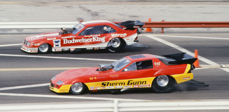 Bernstein ran a Mercury LN7 body –- sister car of the EXP –- and enjoyed great success in 1983, including his U.S. Nationals/Bud Shootout double, before he and Armstrong developed the wind-tunnel-influenced Ford Tempo that helped shape the Funny Car look for the next decade. The opponent in this qualifying matchup at the 1983 World Finals at Orange County Int’l Raceway is Mark Oswald, in his first season in the class after the Candies & Hughes team switched from Top Fuel to Funny Car.