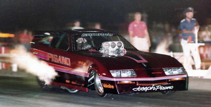 Legendary car owner and piston/engine-block manufacturer Joe Pisano gave Roland Leong a run for driver count (though his tenures were usually longer), employing a roster that included the likes of his brother Frankie, Sush Matsubara, Pat Foster, Jake Johnston, Tom Ridings, Craig Epperly, Al Segrini, Tripp Shumake, Mike Dunn, Glenn Mikres, and Dale Pulde. This would be Shumake in “Papa Joe’s” Camaro in 1983, the year that he and Pisano shocked the troops with a where-did-that-come-from? 5.74 clocking at Orange County Int’l Raceway’s 64 Funny Cars race in early April. It was the fourth quickest pass of all time and the quickest west of the Mississippi, trailing only Prudhomme’s 5.63 and the 5.73 passes of “the Snake” and Ken Veney, all of which took place during the wild Funny Car shootout at the 1982 U.S. Nationals. Shumake (aka “240 Shorty”) and Pisano also went on to win the 64 Funny Cars event, stopping Billy Meyer in the final. Meyer had earned the right to be in the Chicago-style (two low e.t.s) final after running the evening’s second-quickest pass, a mild-by-comparison 5.86 in the Trans Am shown a few photos above, which was being tuned at the event by Bernie Fedderly and the Minor Racing tuning braintrust from Gary Beck’s dragster.