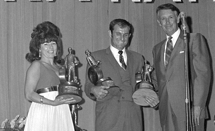 Prudhomme walked away with two of the new trophies, one for 1969 and one for ’65, while Don Garlits needed wife Pat to help him with this three-trophy haul from Indy wins in 1964, ’67 and ’68.