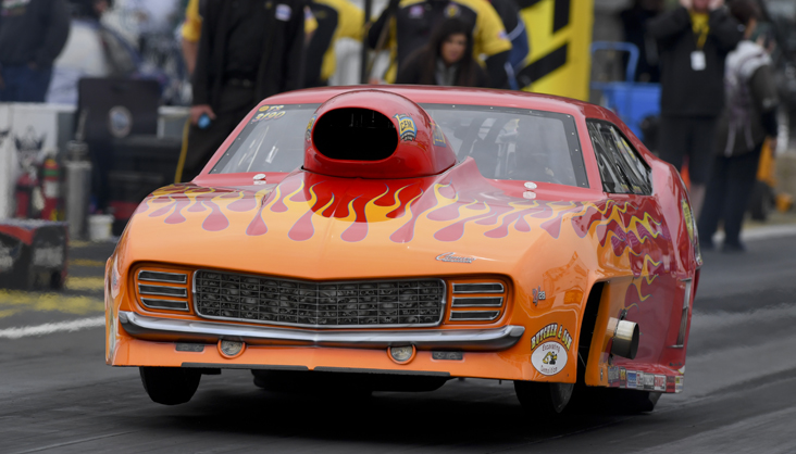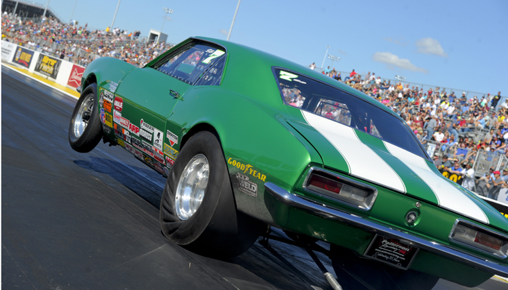 Nicholson’s ’67 Camaro is a unique Super Gas car in that it features a manually shifted four-speed Lenco transmission. The car is also equipped with a “reverse throttle stop” that limits it to top speeds of around 100 mph while still running the 9.90 index. That approach yielded big results for Nicholson, who defeated Mitch Withers in the Super Gas final round, 9.904 to a 9.856 breakout. [video]