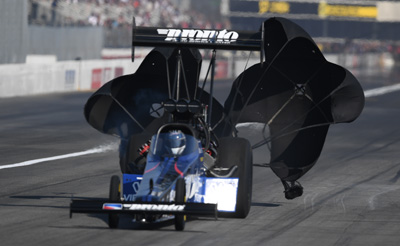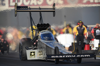 TOP FUEL ROUND 2 (1:25 p.m.): Blake Alexander brought the Clay Millican-David Grubnic driver-crew chief collaboration to an early end by beating the national record holders on a 3.74 to 3.73 holeshot while Steve Torrence ran his Countdown record to 22-0 by beating his father, Billy, with a sizzling 3.67 as he continues to close on an historic first Countdown sweep. Brittany Force also found the 3.60s with a 3.68 to beat Antron Brown but won’t have lane choice against Torrence. Tony Schumacher, in his last race with the U.S. Army, got a break, smoking the tires after Bill Litton had to be shut off on the starting line but he’ll cede lane choice to Alexander.