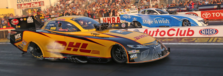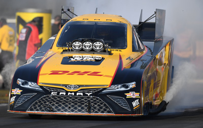 FUNNY CAR FINAL (4:12 p.m.): J.R. Todd, near lane, put an exclamation point on a championship-winning season by also winning the season finale, powering the DHL Toyota to a 3.87 to 3.88 final-round victory over defending event champ Tommy Johnson Jr. The victory is his sixth of the season and third of the Countdown playoffs.