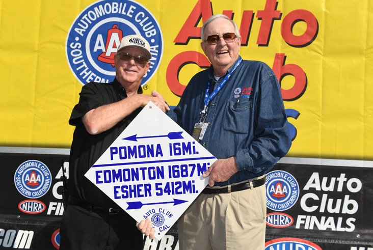 The Auto Club’s Tom McKernan, right, acknowledged the upcoming retirement of NHRA Senior Vice President Graham Light with a throwback AAA road sign specially commissioned for Light’s home that marks the direction and distance to the Pomona racetrack, his former hometown of Edmonton, Alta., and his birthplace in England.