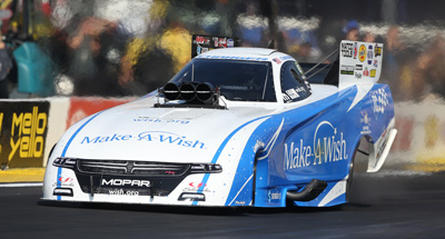 Friday Funny Car qualifying leader Tommy Johnson Jr. wasn’t able to hold onto the pole for what would have been the fourth straight No. 1 qualifying spot for the John Collins-led Make-A-Wish team, but maybe that’s for the best. They didn’t reach the final round after any of those great qualifying efforts and got knocked out in round one in Charlotte.