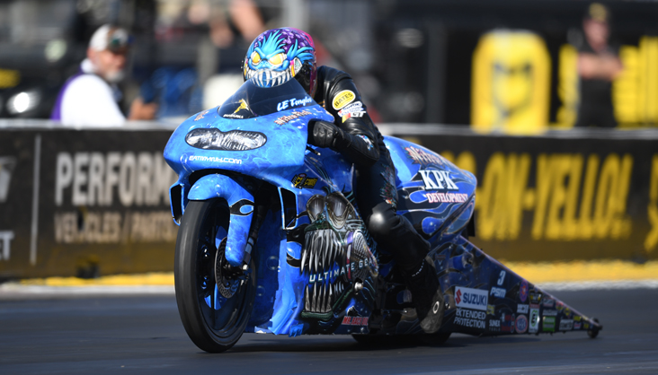 Hector Arana Jr. and LE Tonglet are huge fans of Chip Ellis and Hector Arana Sr. That’s because either Ellis or Arana will race Matt Smith in the second round, assuming he defeats Angie Smith in the first round Sunday. If Smith advances to the second round, the only way for Arana or Tonglet to win a Pro Stock Motorcycle championship is for him to lose and for them to win the whole race.
