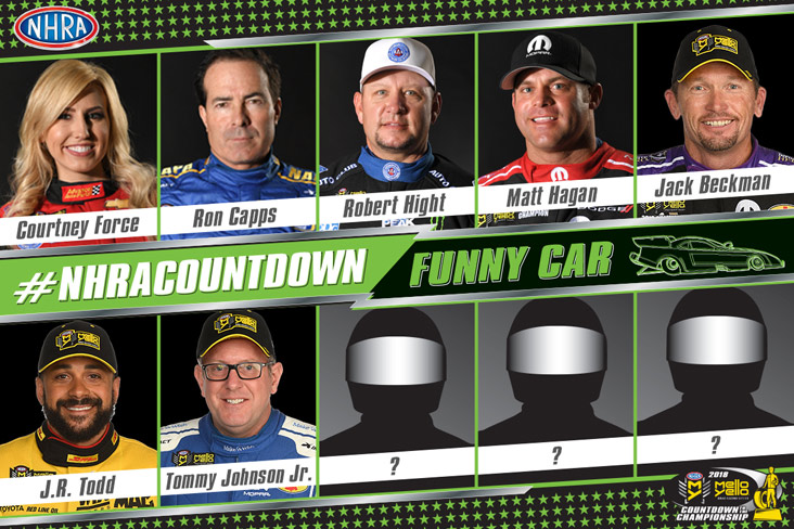 FUNNY CAR: John Force, Shawn Langdon, and Tim Wilkerson currently own spots 8-10 in the Countdown but Bob Tasca III, Cruz Pedregon, and Jonnie Lindberg all still have mathematical chances to join the Top 10 in Indy.