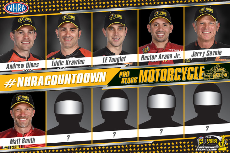 PRO STOCK MOTORCYCLE: Scotty Pollacheck, Angie Smith, Angelle Sampey, and Hector Arana Sr. own spots 7-10 in the Countdown but seven riders (Jim Underdahl, Steve Johnson, Joey Gladstone, Cory Reed, Ryah Oehler, Karen Stoffer, and Mark Paquette) still have a shot at making the Countdown.