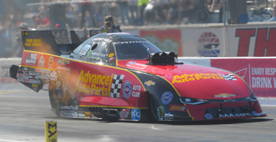 FUNNY CAR Q2 (3:25 p.m.): Courtney Force may have lost the points lead with which she started the Countdown, but the second-gen phenom still knows how to get down the track quick, as her Brian Corradi-tuned Advance Auto Parts Camaro ran its second straight 3.926. In the first session it was only good for second-best behind Jack Beckman’s 3.922, but this 3.926 was the quickest of the round yet not quick enough to get past Beckman for the provisional pole. Tommy Johnson Jr. was right behind her with a 3.928 and Courtney’s father John, was third with a 3.939. Nine drivers qualified in the threes on the opening day.